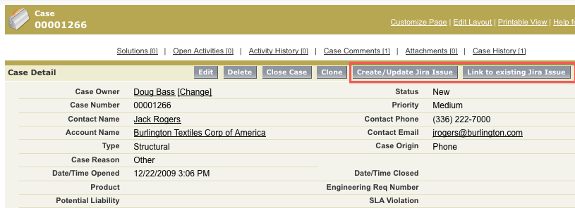 This servlet is used to create or update JIRA issues from a Salesforce.com screen. For example, a typical Salesforce.com looks like: