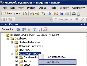 Login using SQL Server Management Studio – right click on <orgname>_MSCRM click on New Query