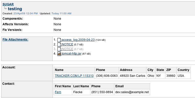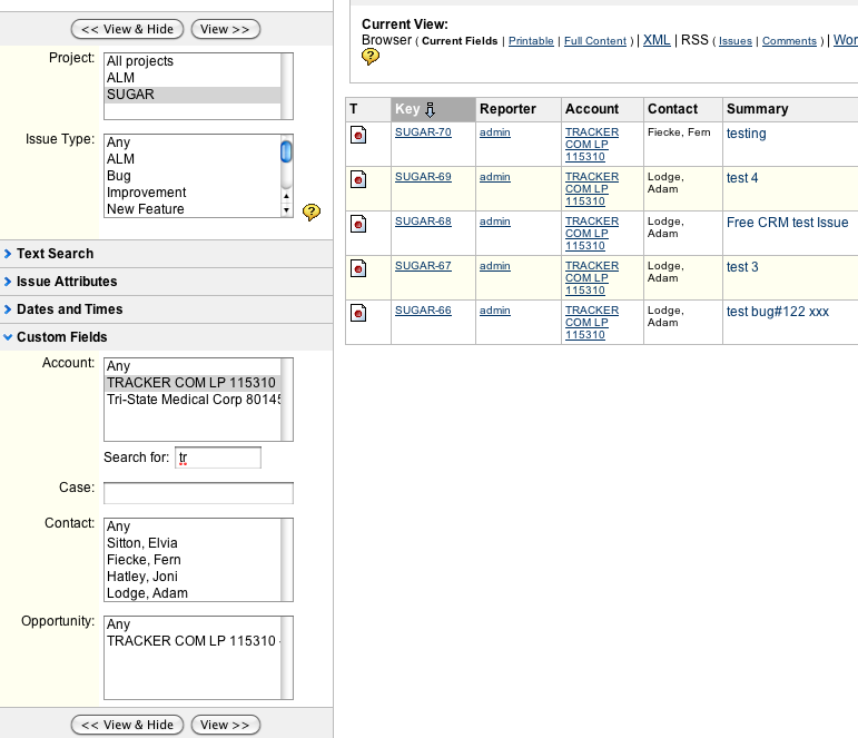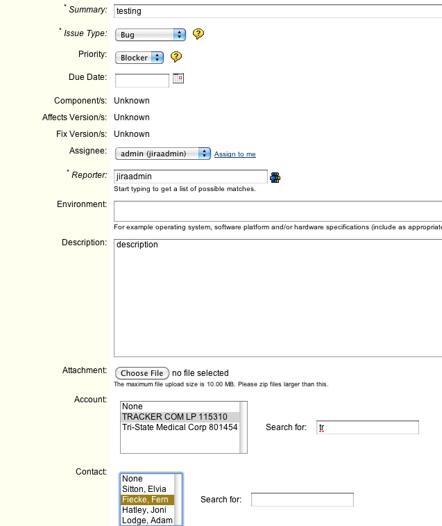 This configuration Go2Group's CRM Plugin can be used to lookup account and contact data from a JIRA issues' create or edit screen, and the account and contact can then be stored with (i.e., associated with) the JIRA issue. Searching and sorting of JIRA issues can then be done by your CRM account and/or contact.