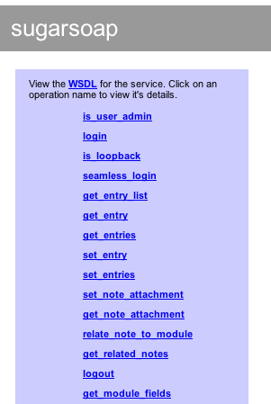 For SugarCrm, setting up the CRM URL field is required. An example of a SugarCrm URL is http://localhost:8082/sugarcrm.soap.php. To test your URL setting, open this same page in your browser and you should see a screen that looks like: