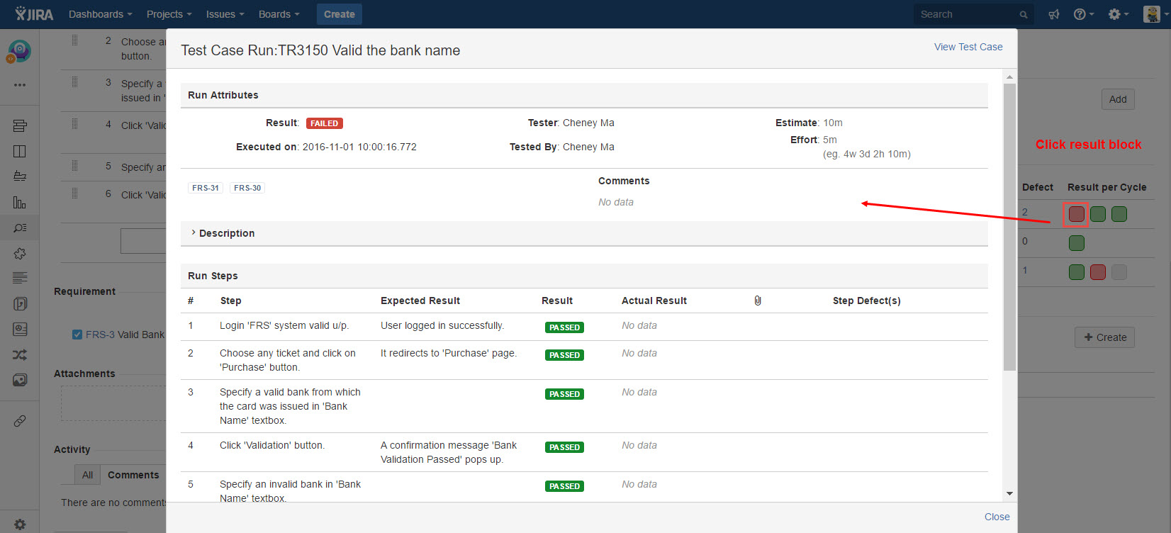 4. If you click the (colored) test cycle blocks, test case run dialog with detailed execute informaiton will be presented.