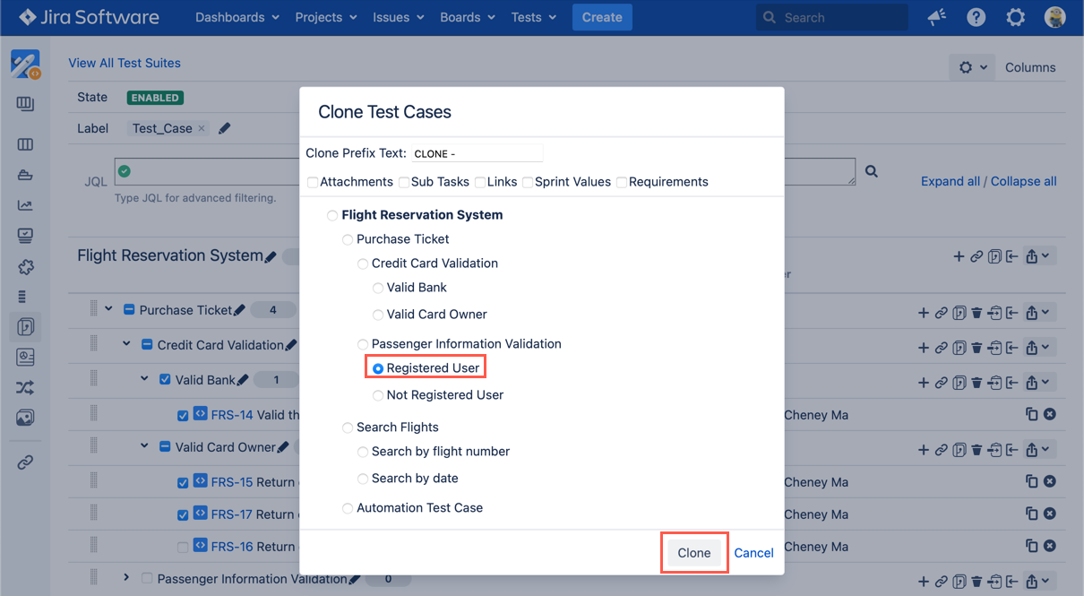 - Select a target Test Suite and click 'Clone' button.