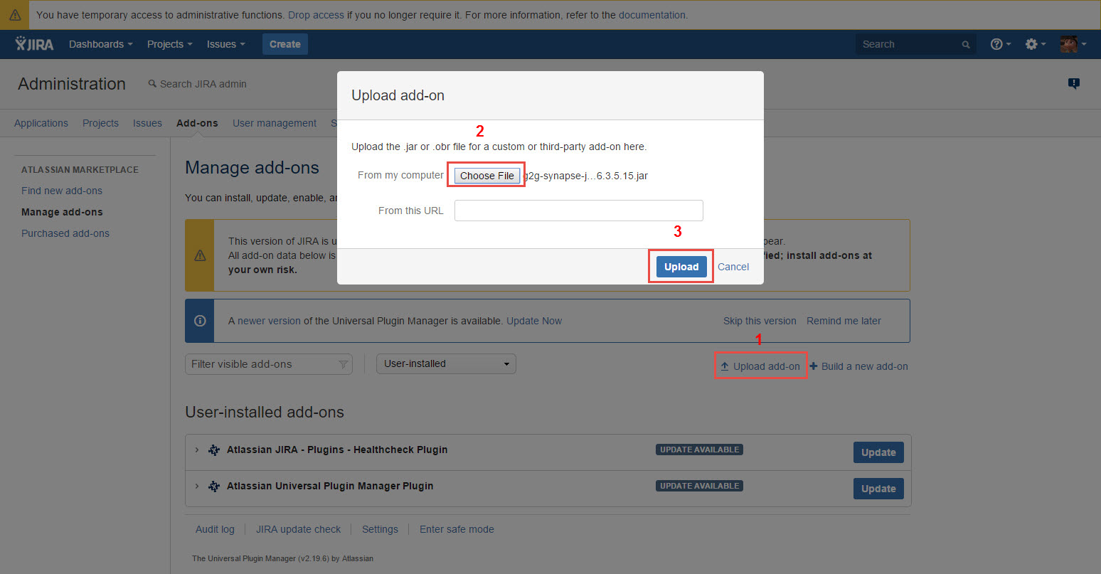 Click the “Upload add-on” button, browse to installation file (.jar file), and click the “Upload” button