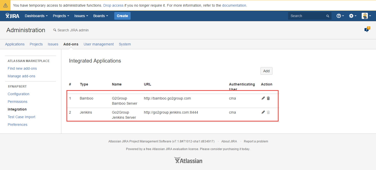 Specify below information and click "Add" button - Name: enter a unique name to refer this application - URL: enter the Base URL of the application (please read below on how to find Base URL from your server) - User: enter the user name used for authenticating with the application Note: The user must have 'Admin' permission to trigger the job/plan that you want to trigger from TestRay