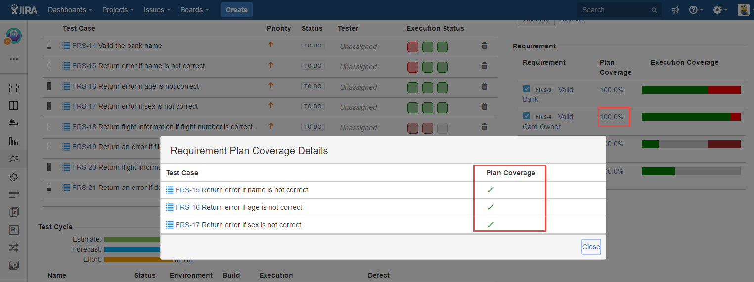 Execution Coverage - This dialog displays a list of Test Cases those are planned for execution from the particular Requirement, followed by test results in different Test Cycles.