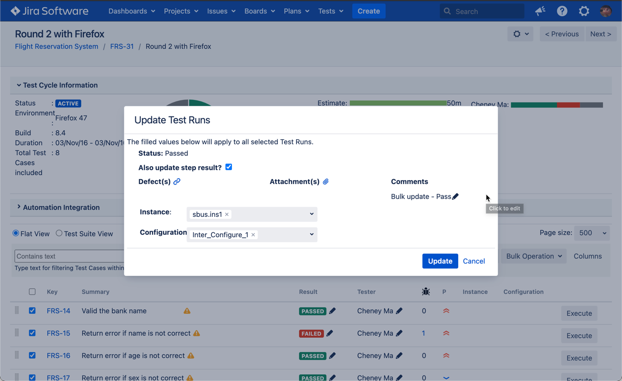 - Click "Update" button, all Test Case Runs you selected will be updated to result you specified, along with above additional execution information.