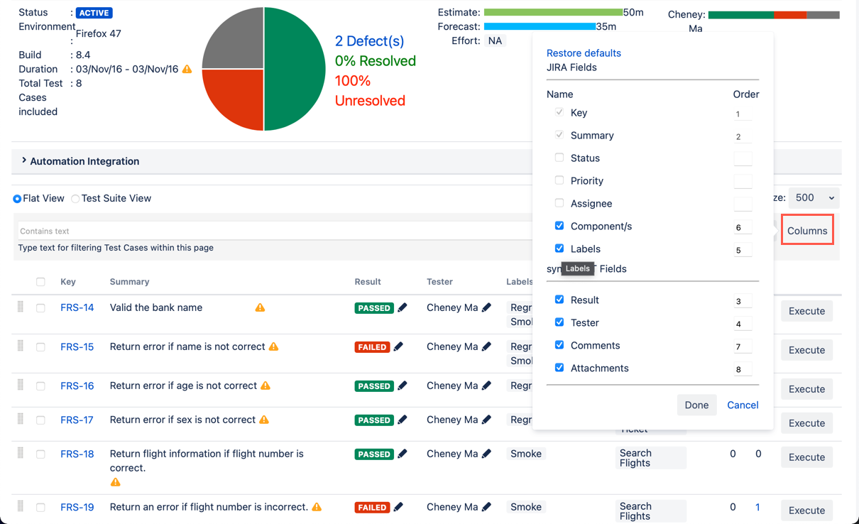 Add/Remove Columns in Test Cycle