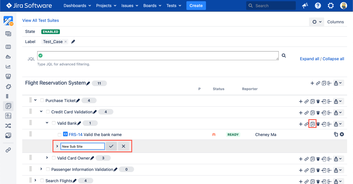 - Click the "Add Test Suite" icon from any Test Suite in the tree structure