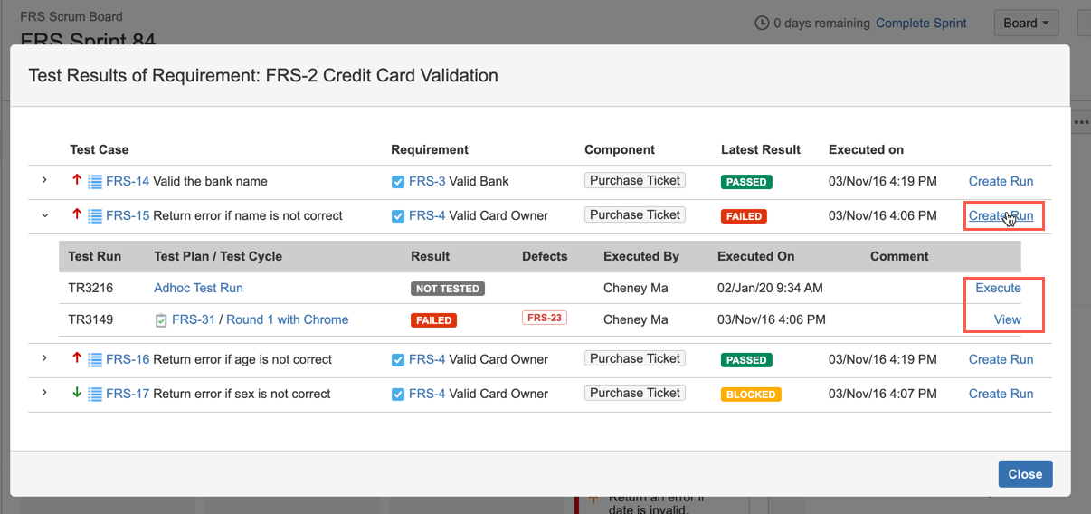 - Only "Test Runs" those have current "Sprint" information specified will be listed under Test Cases.