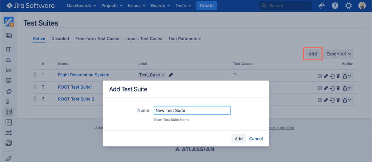 - Click the "Add" button; an "Add Test Suite" dialog box will pop up