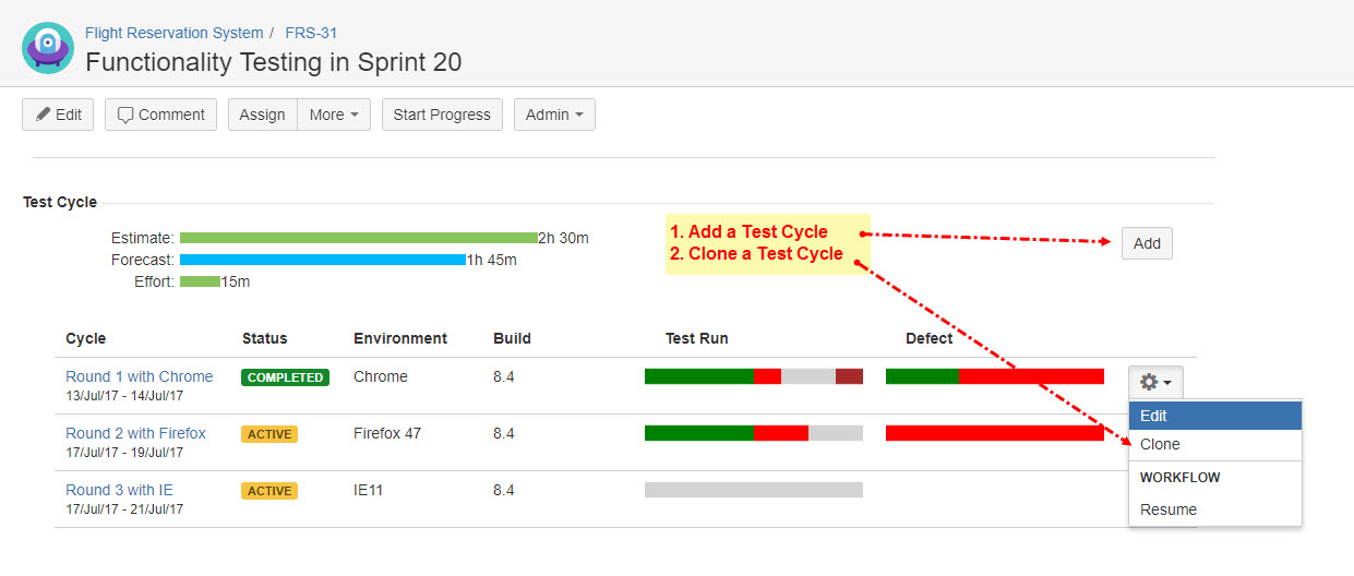 - Clone a Test Cycle: User can either create a new test cycle with test assignment information or only with tests those are in particular result/s by this option. It helps the user to 'retest' test cases those are in particular result/s (e.g. Failed, Blocked) in last round of testing.