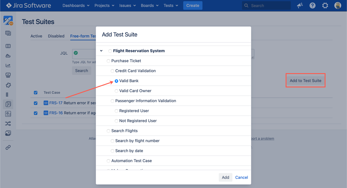 To associate Free-form Test Cases to any existing Test Suite, follow these steps: