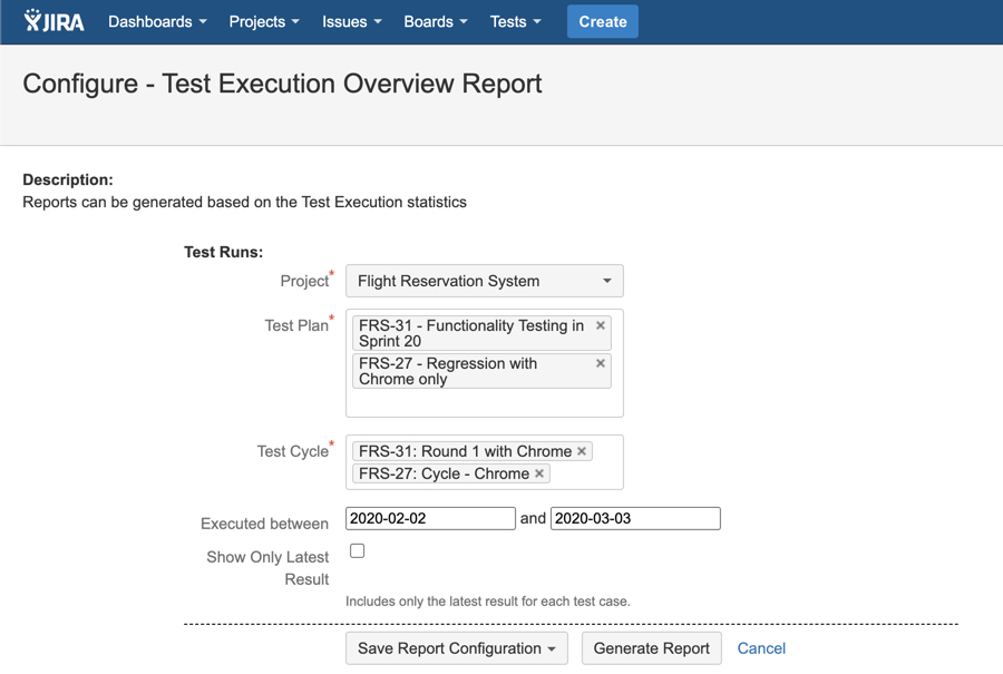 - Show Only Latest Result: if this option is enabled, only the latest test execution results will be picked up from multiple test cycles and then present in the report