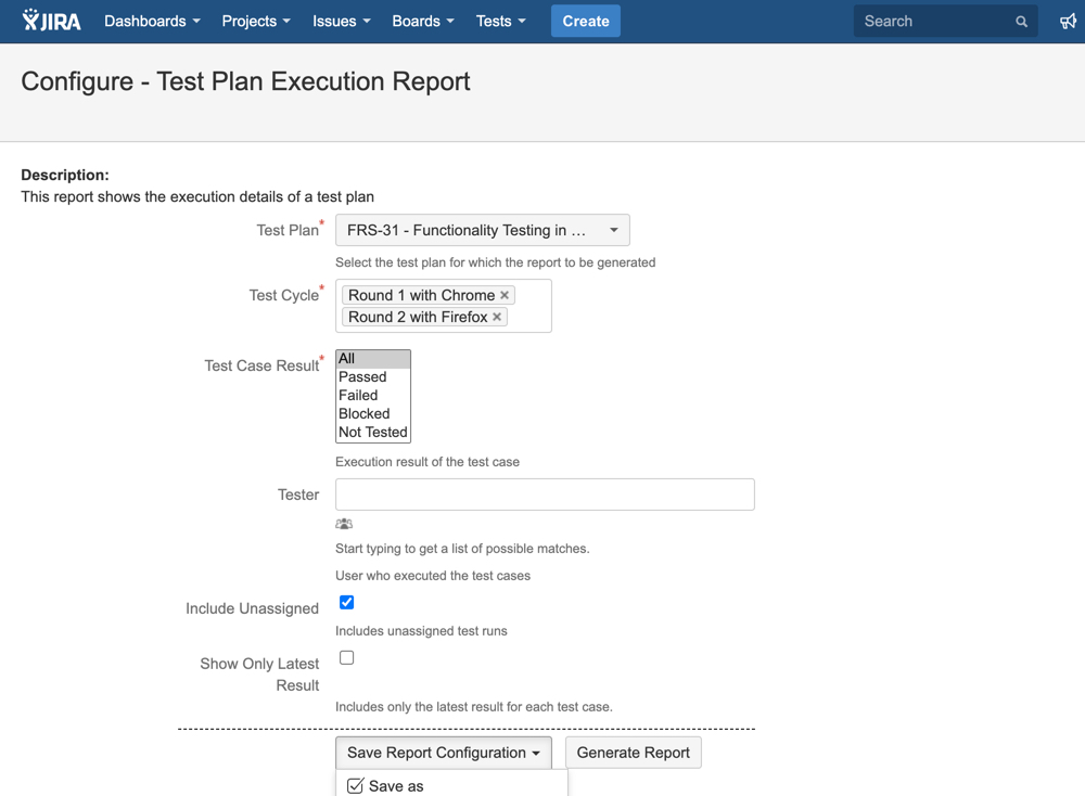 - Include Unassigned: if this option is enabled, unassigned Test Runs will also present in the report