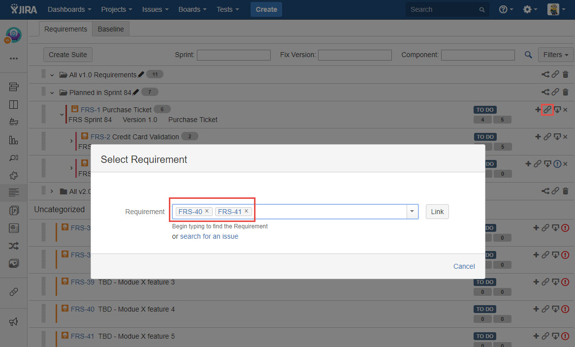 Note: If you have a large number of requirements that need to be linked to a requirement, we suggest you use the "Advanced Search" function to select them in multiple. - The linked requirement will be presented as a child requirement.