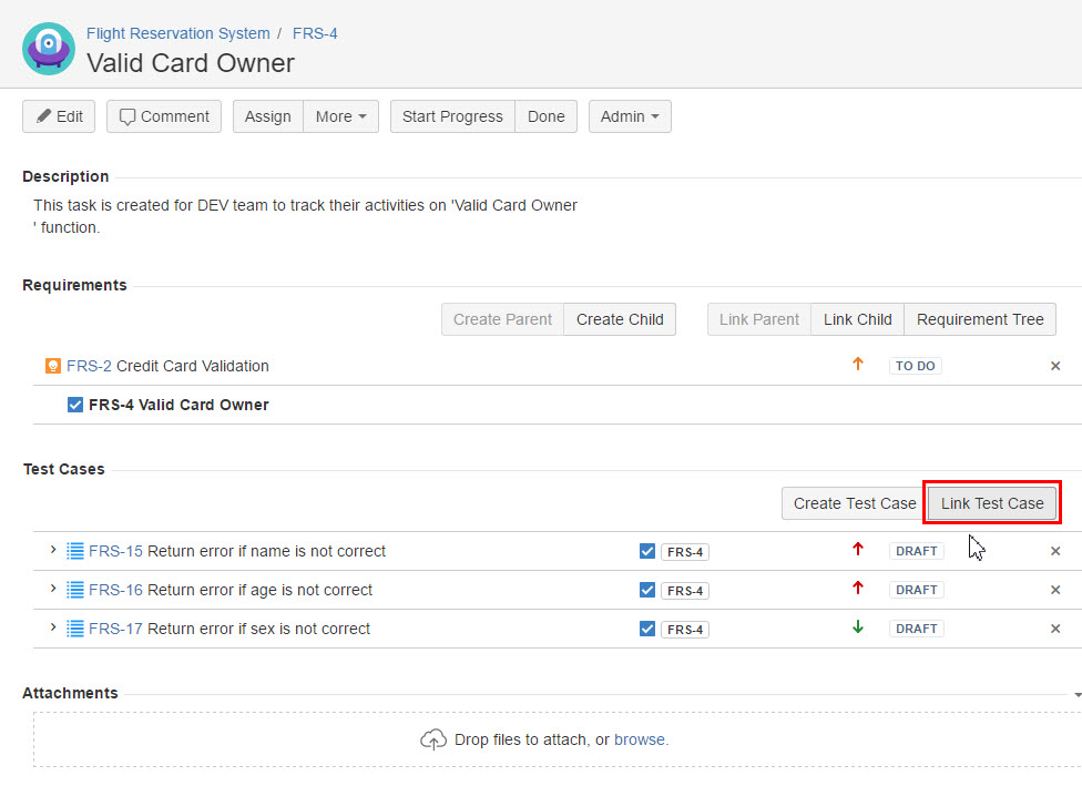 - Click the "Link Test Case" button from the Test Cases section