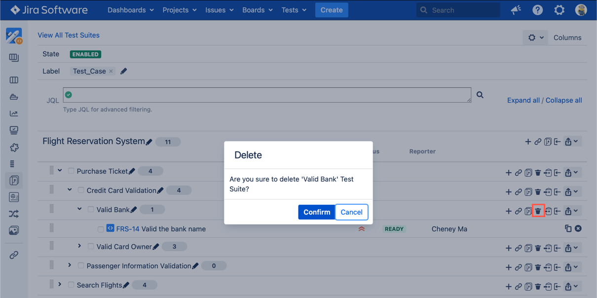 - Click the "Delete" icon from any Test Suite in the tree structure