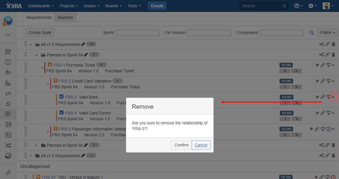 - Click the "Remove from parent" icon from any requirement in the list.