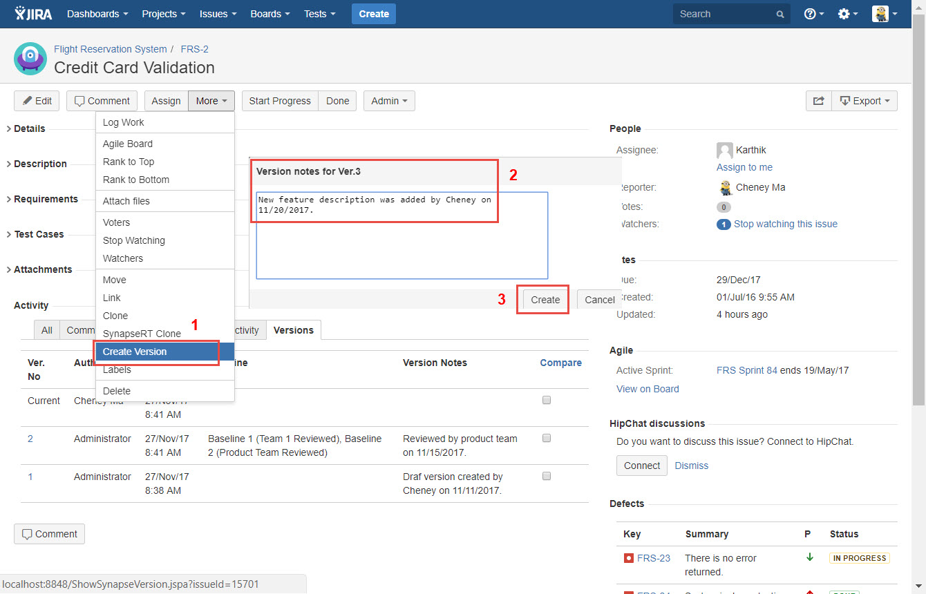 The newly created version will be listed in "Versions" tab at the bottom of the issue in "Activity" section.