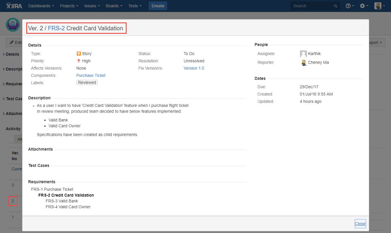 - Ver. No: version number tag generated automatically when the requirement version is created