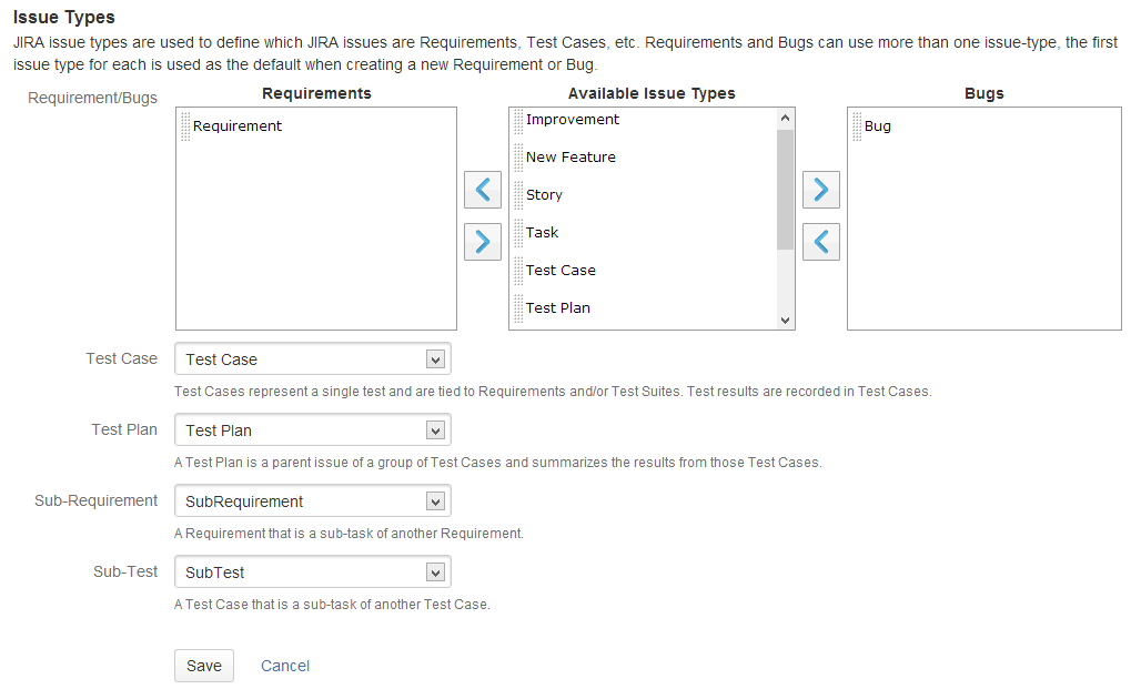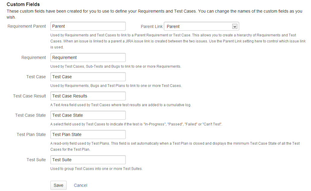 | Parent Custom Field and Parent Link | Parent custom field is used by requirements and test cases to link to a parent requirement or test case. This allows us to create a hierarchy of requirements and test cases. When a requirement or test case is linked to it's parent, a JIRA issue link is also created. The type of link is determined by the Parent Link. |