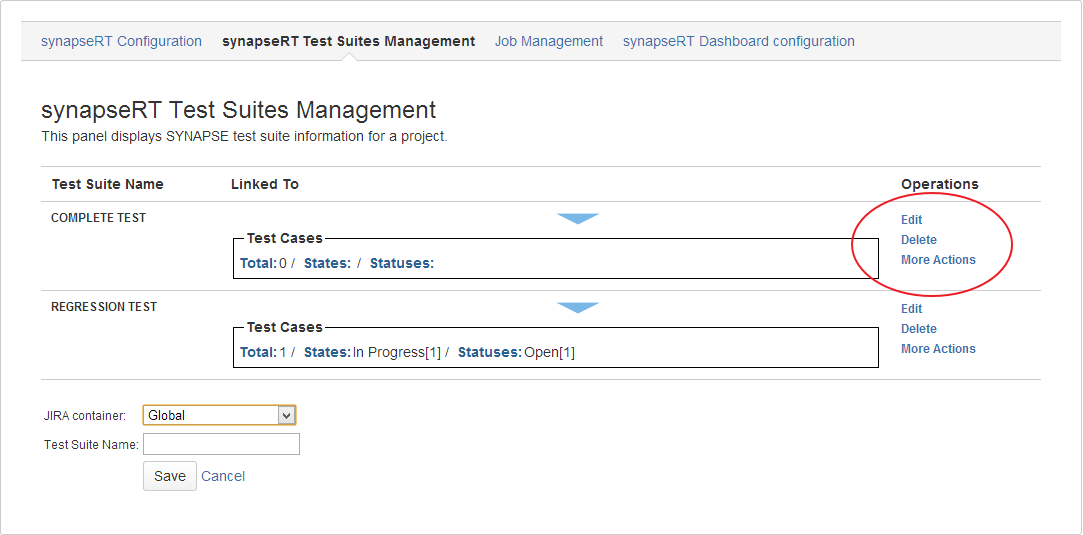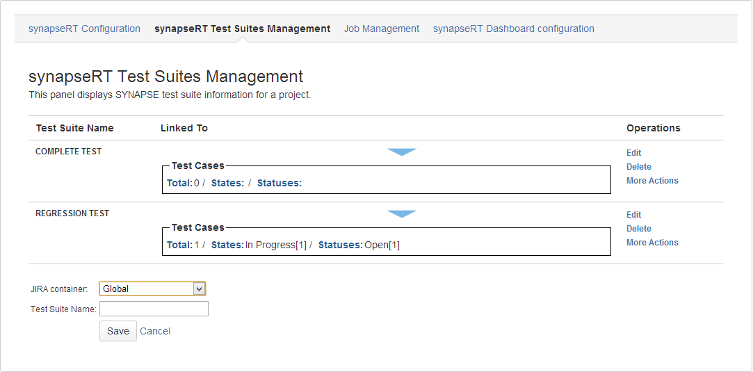 Open the synapseRT Test Suites Management link in Administration->Add-ons to access the Test Suites Management panel.