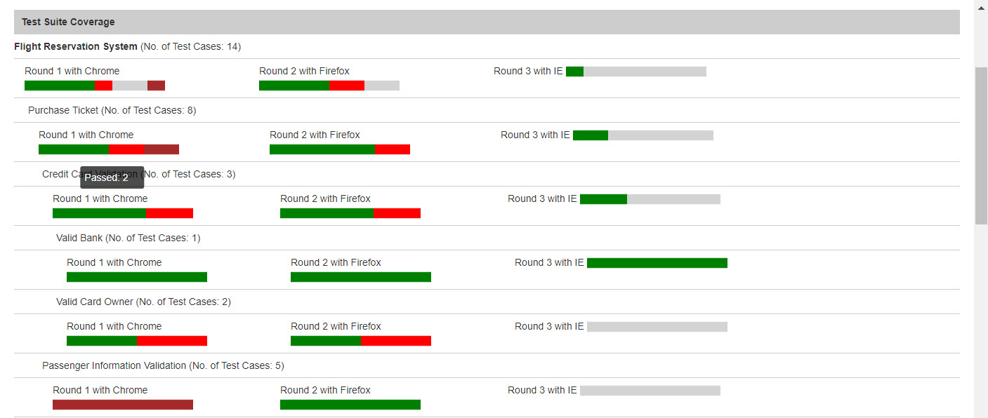 - Requirement Coverage Report: it shows the passed percentage of the test cases related to requirements.