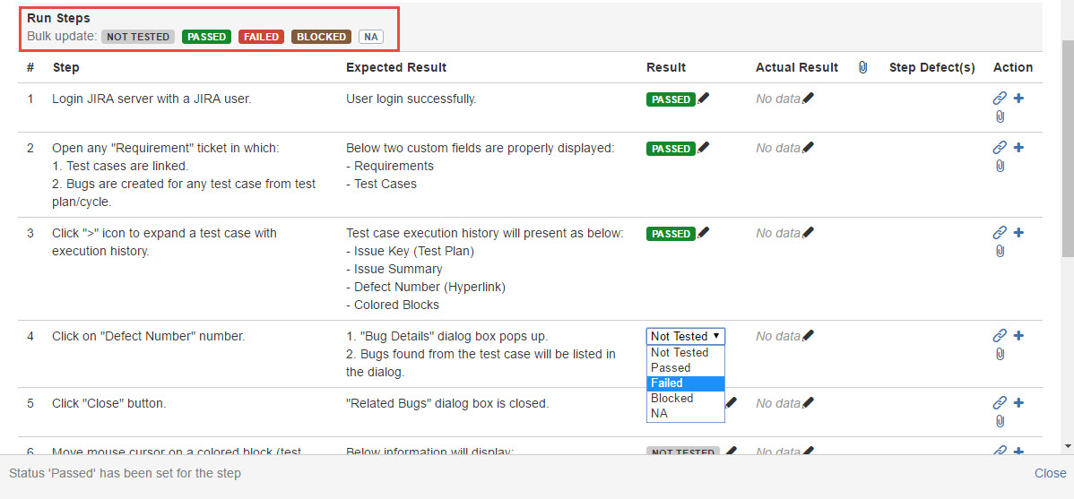 You can either update test step result one-by-one, or bulk update all steps result by one click.