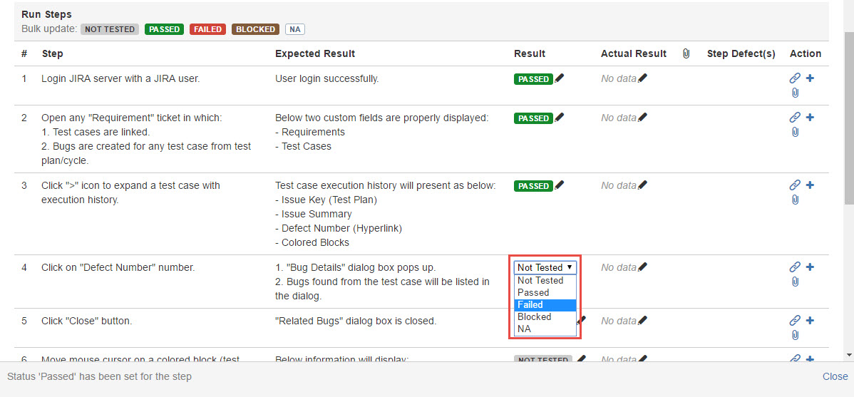 - NA: Not Tested, set all test steps to "NA" status - Click the "Close" button to save and close test result, or click "Next" button to save the result and navigate to next test case run.
