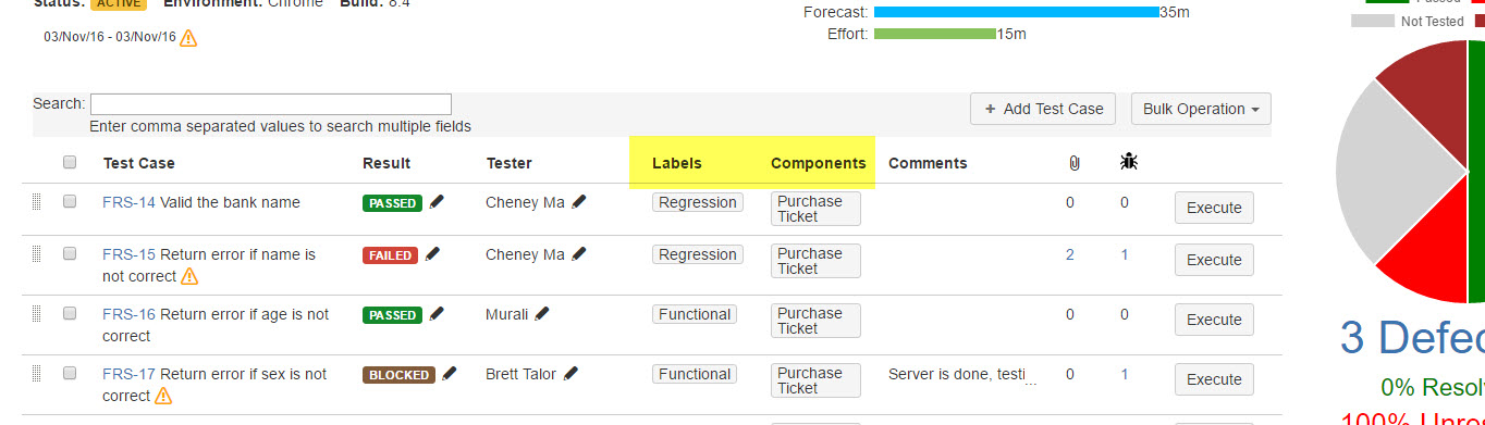 - Two more columns 'Components' and 'Labels' in Test Cycle page