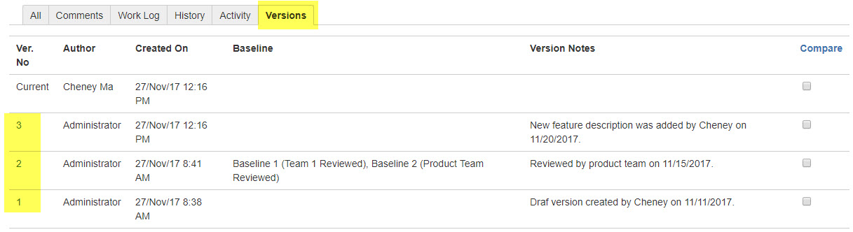 - The user can check any saved version of a requirement and also be able to compare any of two saved versions of the requirement.
