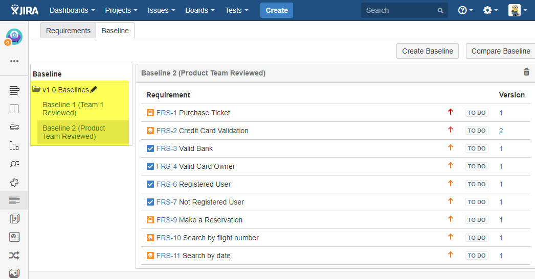 - The user can compare two different baselines to check for important modifications, additions, and deletes for the set of requirements which are approved by stakeholders.