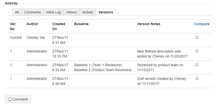 要件のバージョン機能は、要件の変更を記録して "バージョン番号" で変更履歴をラベルするものです。これによりユーザーは要件の変更を追跡できます。