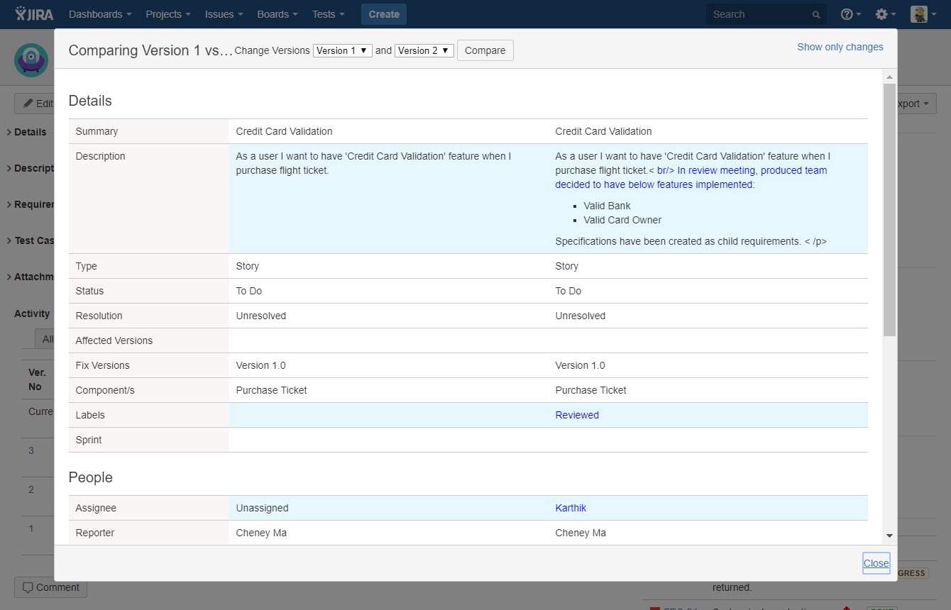 ユーザーは、2 つの異なる要件バージョン間で行われた変更や差異を確認するため、この 2 つのバージョンを比較できます。