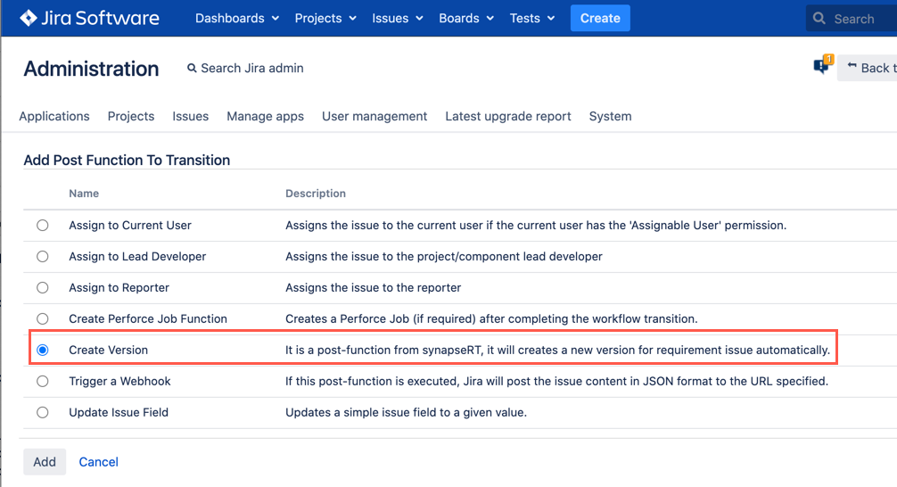 synapseRT では、 'バージョンの作成' 事後操作を通して要件のバージョンを自動で作成することもできます。要件バージョンが課題ステータスのトランジション中に自動で作成されるよう、事後操作を JIRA ワークフローで設定できます。