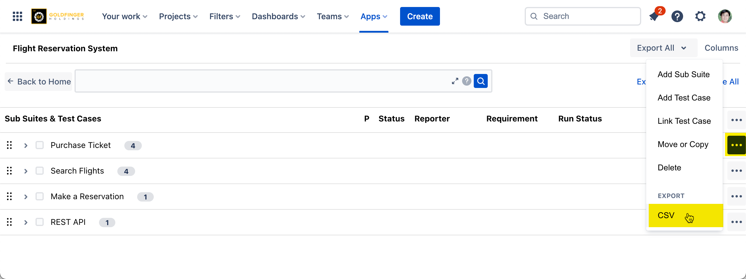 Launch a specific test suite, then find a sub suite and ‘Export->CSV’.