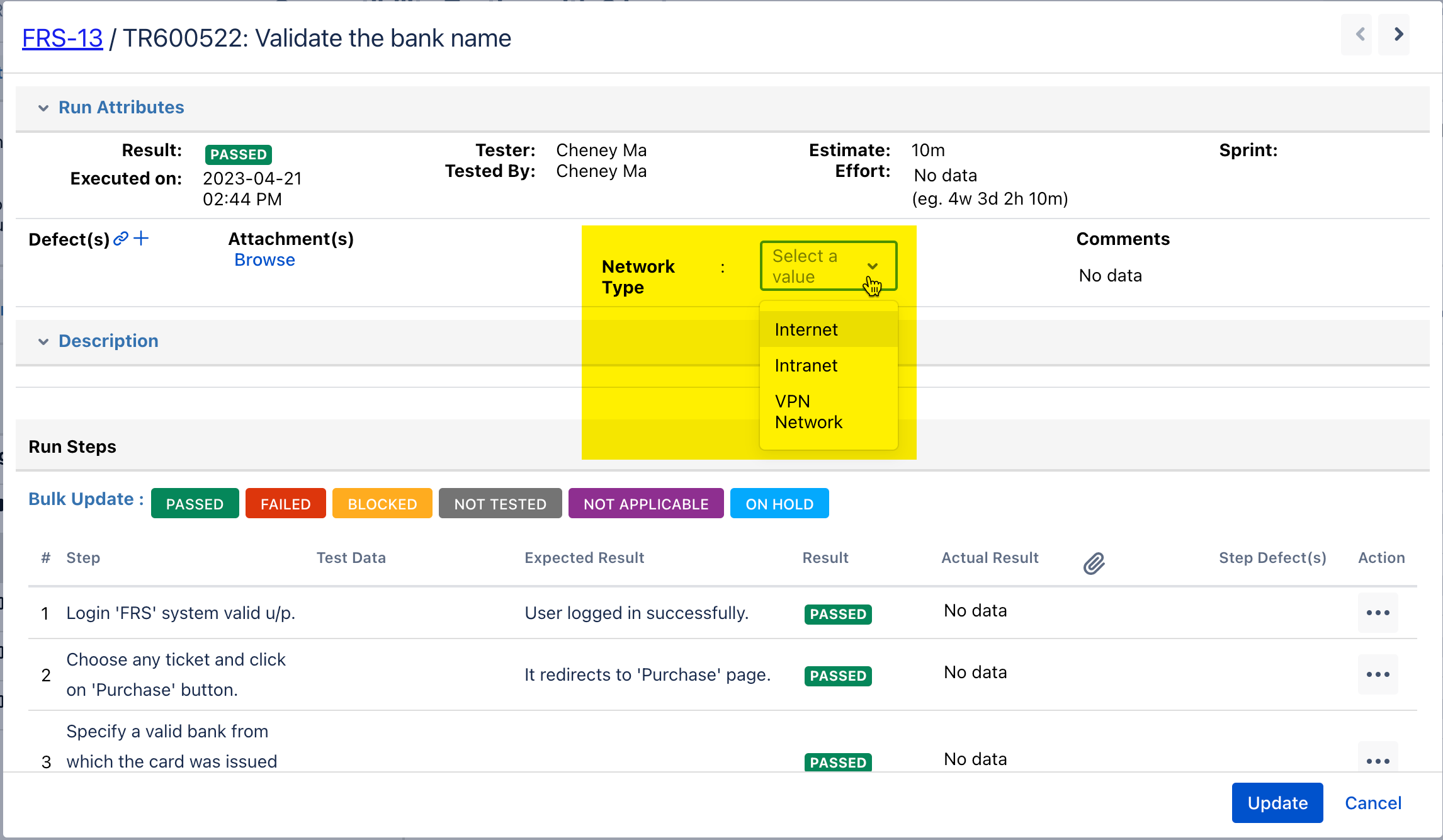 Update Test Run Field Value During Execution