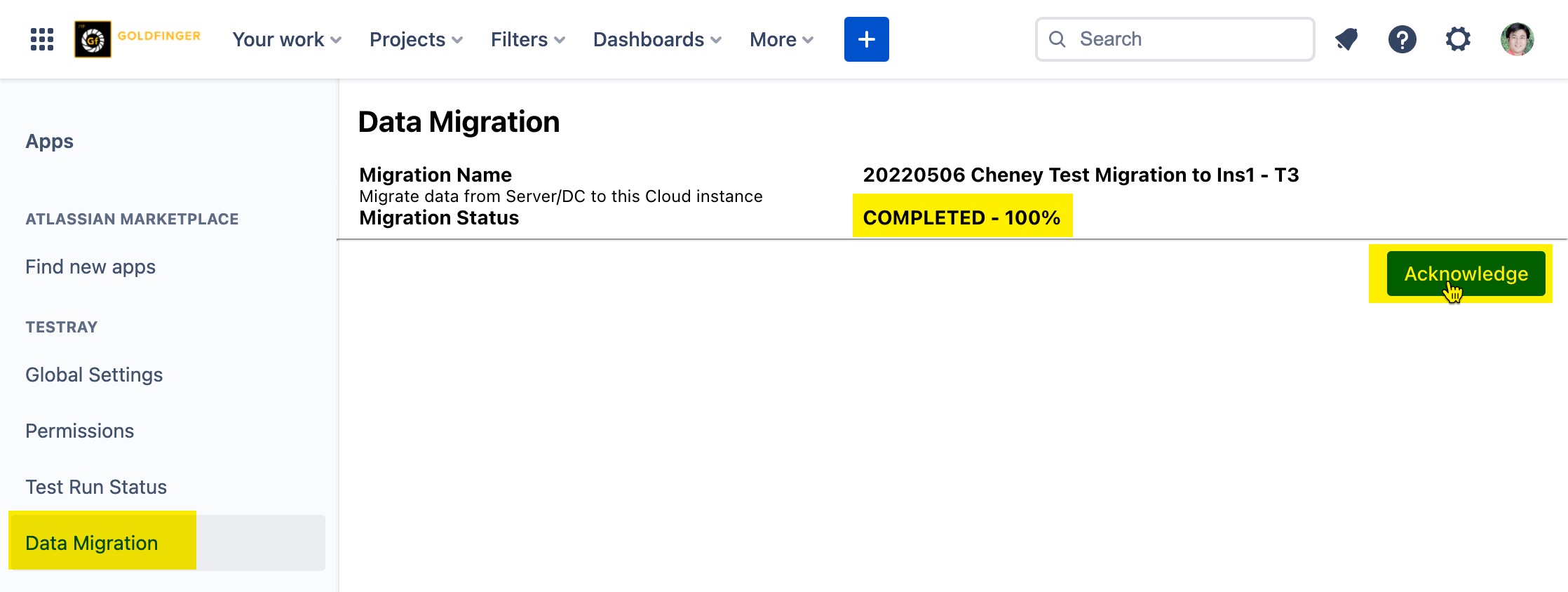 4. Check and confirm migrated data, then click 'Acknowledge' from TestRay 'Data Migration' screen