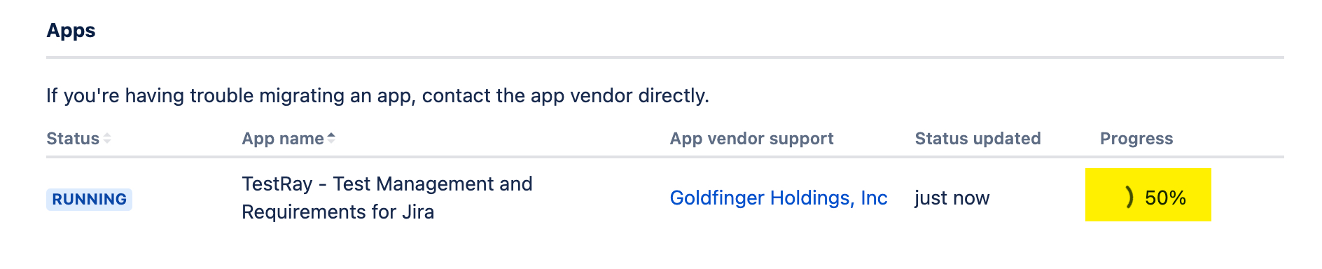 After migration is started from TestRay Cloud side, you can go back to Jira Server/DC side to check app migration progress.