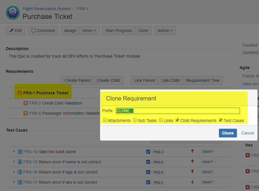 - Clone a Requirement with its child Requirements and associated Test Cases.