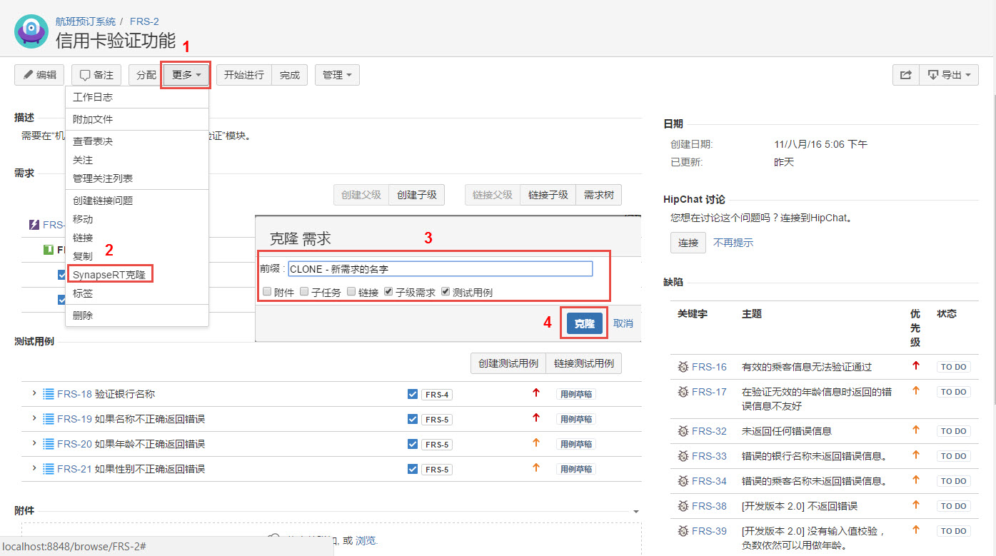 用户可以在查看需求问题的时候用“SynapseRT克隆”选项来克隆需求。此操作可以节省用户创建需求的时间。