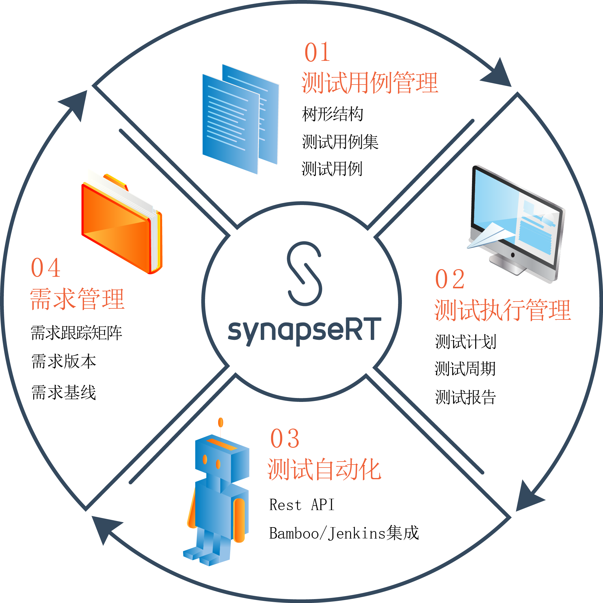 synapseRT做为一个JIRA插件可以大大增强JIRA对于软件需求管理和软件测试管理的功能。它能够帮助开发团队在软件项目中高效,方便的协作;能够帮助测试团队方便快捷的组织测试用例和计划,执行测试。同时将需求和测试用例,测试结果完美的结合在一起,使整个项目团队在各阶段计划、构建和发布更好的软件产品。它主要包括以下4个模块: