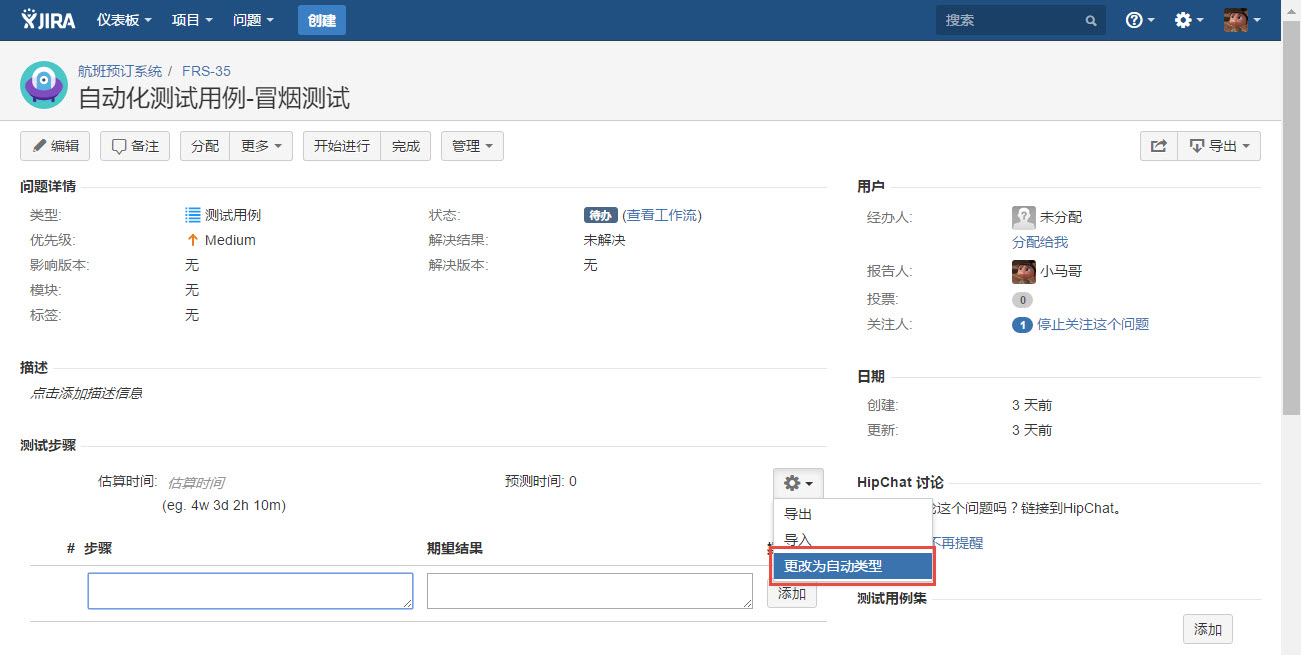 由于synapseRT集成了持续集成工具Jenkins和Bamboo,用户可以将测试用例的类型从“手动”(默认值)更改为“自动”,请按照下面的步骤来创建类型为“自动”的测试用例: